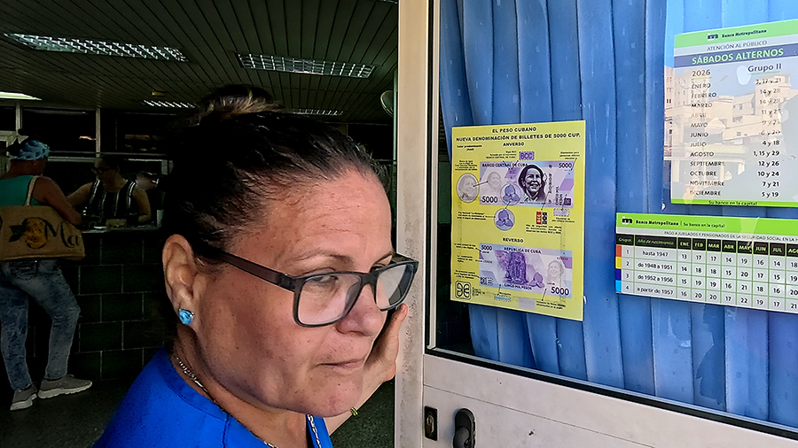 Una mujer junto a la puerta de una sucursal del Banco Metropolitano, en La Habana. Los problemas en el transporte público dificultan el trayecto a los centros laborales y muchas personas caminan largas distancias de ida y vuelta a sus hogares.