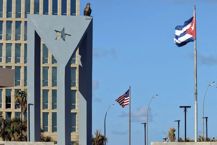 Fotografía de archivo que muestra las banderas de Estados Unidos y Cuba frente la Embajada de Estados Unidos, en La Habana (Cuba). EFE/ Ernesto Mastrascusa