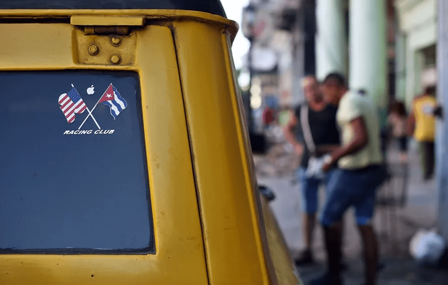 Fotografía de archivo de unos adhesivos de las banderas de Cuba y Estados Unidos, pegadas en un vehículo estacionado en una calle de La Habana (Cuba). EFE/Alejandro Ernesto